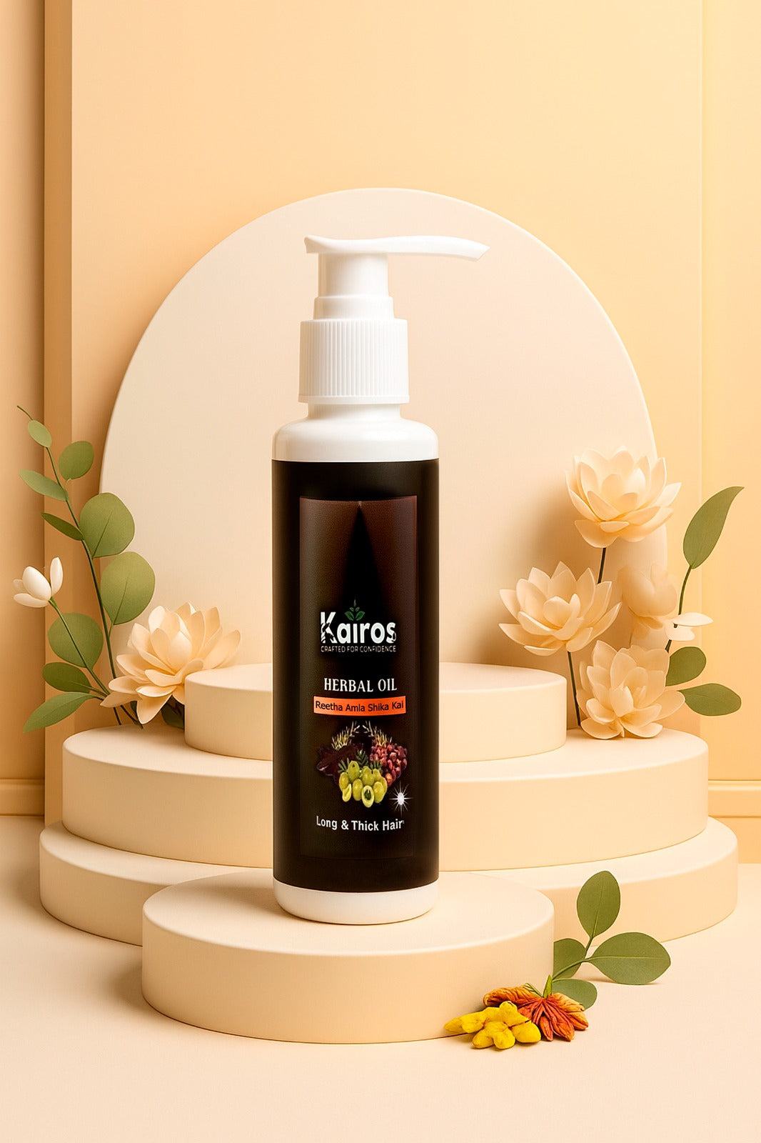 Nourish your hair naturally with Kairos Herbal Oil, enriched with the goodness of Reetha, Amla, and Shikakai. This powerful herbal blend helps promote long, thick, and healthy hair by strengthening roots and reducing hair fall. Ideal for regular use on all hair types.